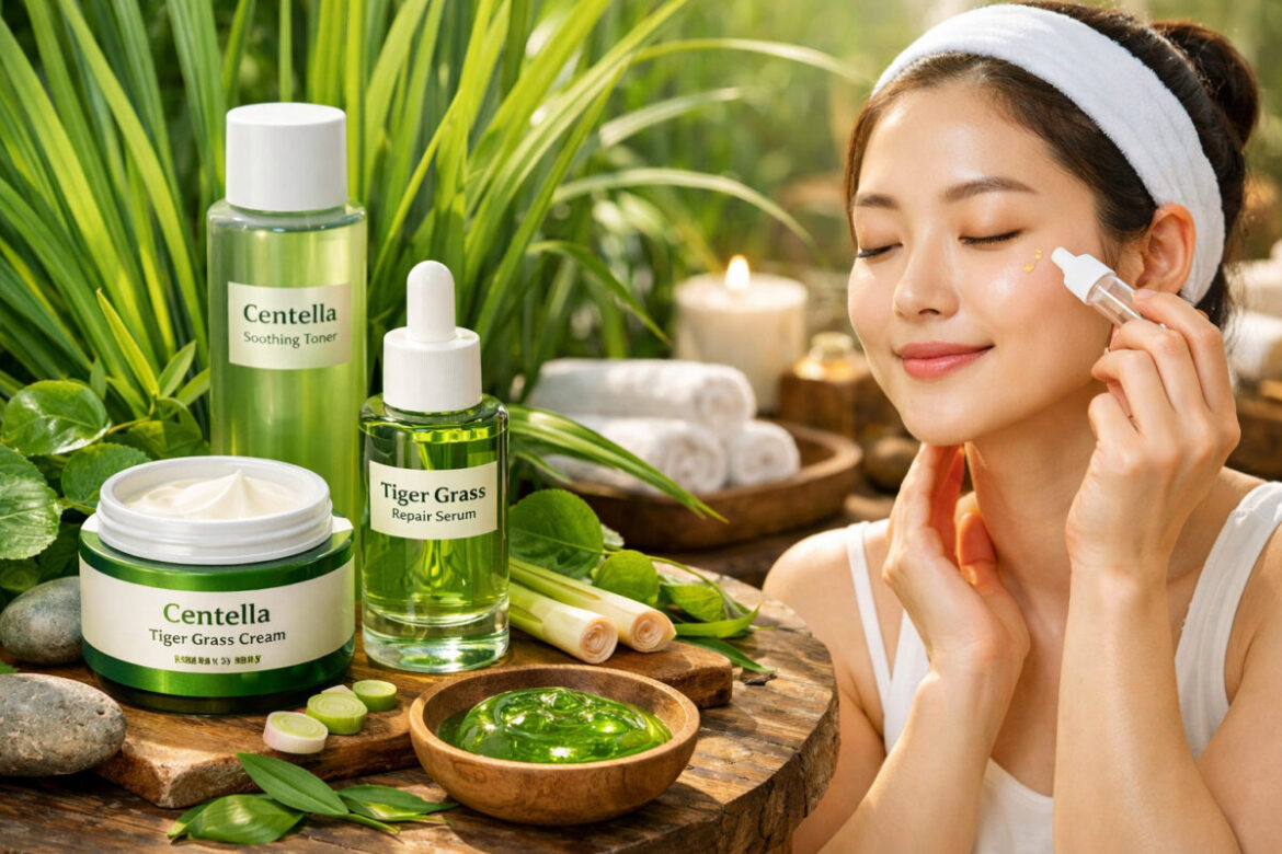No centro desta tendência está a Centella, uma planta amplamente utilizada na skincare coreana e conhecida pelas suas propriedades calmantes e regeneradoras.